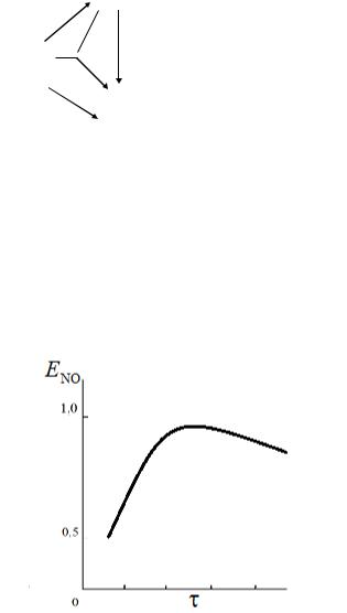 Эта схема была установлена экспериментально: подавая только NO на катализатор, наблюдали образование азота и кислорода по реакции 2NO = N2 + O2; подавая смесь NH3 и NO, наблюдали образование N2 по реакции 4NH3 + 6NO = 5N2 + 6H2O. Такая схема превращения объясняет экстремальную зависимость выхода оксида азота от времени превращения - рис. 2. С ростом реакционная смесь «задерживается» на катализаторе и создаются благоприятные условия для разложения образовавшегося NO до азота.