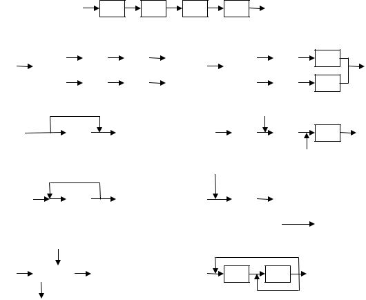 Структура связей (технологические связи). Последовательность прохождения потоков через элементы ХТС определяет структуру связей и обеспечивает определенные условия работы элементов системы. Основные типы структуры связей показаны на рис. 2. Здесь прямоугольники представляют элементы, линии со стрелками - связи и направления потоков.