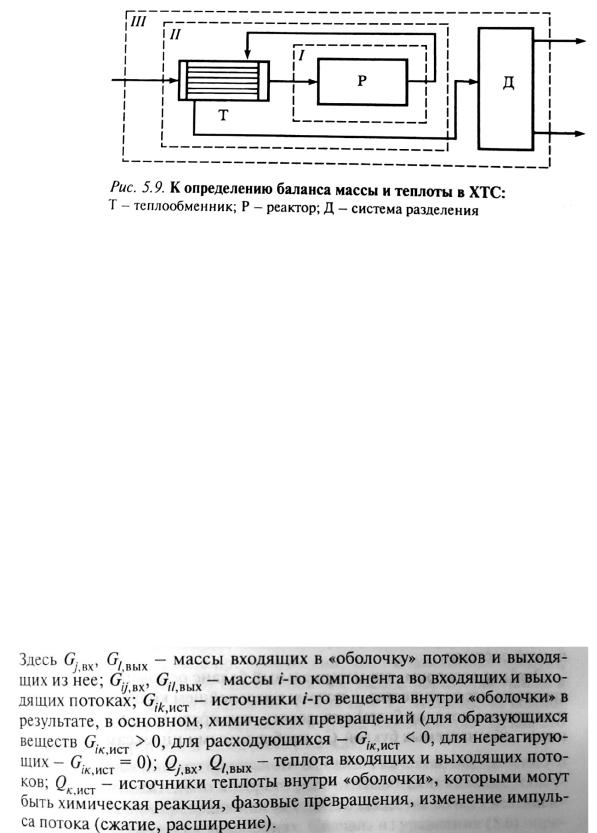 Пусть имеется ХТС, состоящая из теплообменника, реактора и системы разделения (рис. 5.9) В ней пунктирными линиями выделены как оболочкой один элемент - реактор (I), подсистема реактор с теплообменником (II) и вся ХТС (III). В каждую из этих "оболочек" какие-то потоки входят и какие-то выходят. Внутри каждой оболочки происходят какие-то изменения входящих в нее потоков в выходящие. Фактически каждая из "оболочек" есть подсистема ХТС.