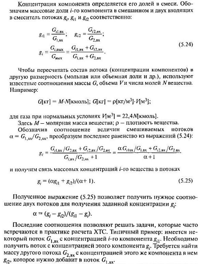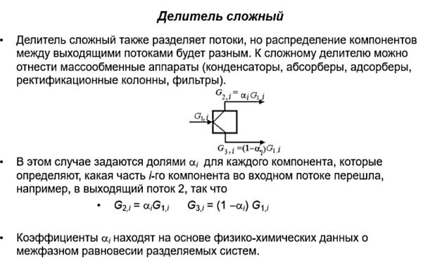 Концентрации компонентов в потоках на выходе из простого делителя не изменяются. Аналогичные балансовые уравнения можно получить, если использовать мольные или объёмные потоки.