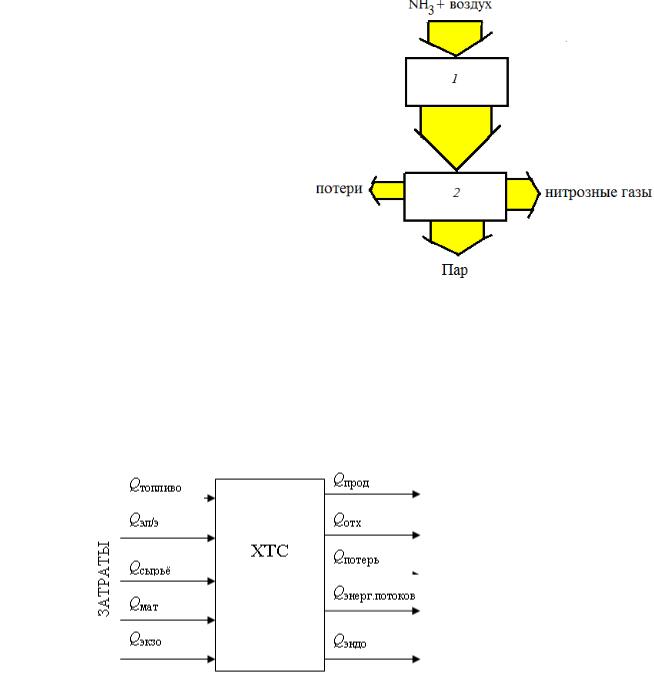 Источниками являются входящие потоки, несущие энергию топлива Qтопл, электроэнергию Qэн, теплоту сырья Qсыр и вспомогательных материалов Qмат, а также экзотермические реакции Qэкз. Их суммарное количество, или потребление, затраты энергии, - Qзатр. Из системы энергия выводится с потоками продуктов Qпрод и отходов производства Qотх, с энергетическими потоками Qэн, затрачивается на проведение эндотермических реакций Qэнд и теряется естественным путем Qпот. Из выходящих энергетических потоков полезно используется Qэн в виде пара котловутилизаторов, нагреваемых в теплообменниках-утилизаторах внешних потоков