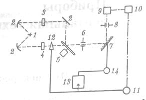 Рис. 1.4 Блок-схема двухлучевого сканирующего ИК-спектрометра [4, c.288]: 1 – источник ИКизлучения; 2 – система зеркал; 3 – рабочий пучок и образец; 4 – пучок сравнения и компенсатор фона; 5 – прерыватель-модулятор; 6 – входная щель монохроматора; 7 – диспергирующий элемент (дифракционная решетка или призма с зеркалом Литтрова); 9 – приемник; 10 – усилитель; 11 – мотор отработки; 12фотометрический клин; 13 – самописец; 14 – мотор развертки
