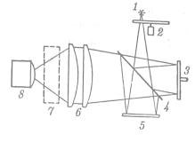 На рис. 1.5. в качестве примера представлена принципиальная оптическая схема Фурье-спектрометра, построенного по принципу Майкельсона. Поток ИК-излучения от источника 1, модулированный прерывателем 2, делится светоделителем 4 на два пучка. Один из них направляется на зеркало 3, которое связано микрометрической передачей с двигателем и может поступательно перемещаться с определенной длиной пробега и возвращаться в исходное положение. Отраженный от этого зеркала пучок интерферирует, имея заданную зеркалом 3 разность хода, с пучком, отраженным от закрепленного зеркала 5. Дальше излучение фокусируется линзами 6 на приемнике 8, проходя через исследуемый образец, помещенный в кюветное отделение 7. При движении зеркала 3 и интерференции пучков с изменяющейся разностью хода происходит сканирование в определенном спектральном диапазоне.