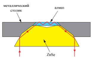 Кристалл, используемый в НПВО спектроскопии, должен иметь большой коэффициент преломления. В общем случае, коэффициент преломления кристалла должен быть больше, чем коэффициент преломления исследуемого образца. В нашем случае в качестве кристалла для НПВО использовался селенид цинка с алмазным окном. Это обусловлено тем, что алмаз идеально подходит для спектроскопии НПВО по своим химическим и физическим свойствам. Он не подвержен действию сильных кислот, щелочей, окислителей и др. химических веществ, что позволяет работать с любыми веществами. Абразивная стойкость алмаза делает возможным съемку, твердых порошков без повреждения алмазного окна. Единственным недостатком алмаза является его цена, поэтому алмаз используется в небольшом количестве в окне приставки НПВО. Остальная часть кристалла для НПВО представлена кристаллом селенида цинка, который сходен с алмазом по значению коэффициента преломления и при этом намного дешевле, что делает его экономически выгодной заменой алмазу.