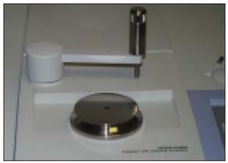 Существует множество типов приставок для снятия спектров НПВО, однако наиболее удобными и распространенными являются приставки горизонтального типа, которые позволяют легко анализировать как жидкие, так и твердые образцы различного состава. Приставка представляет собой металлический столик для образцов с алмазным окошком в центре (Рис. 2.2) и прижимное устройства (винт), которое обеспечивает хороший контакт материала образца с кристаллом алмаза. Общий вид приставки изображен на фотографии ниже (Рис. 2.).