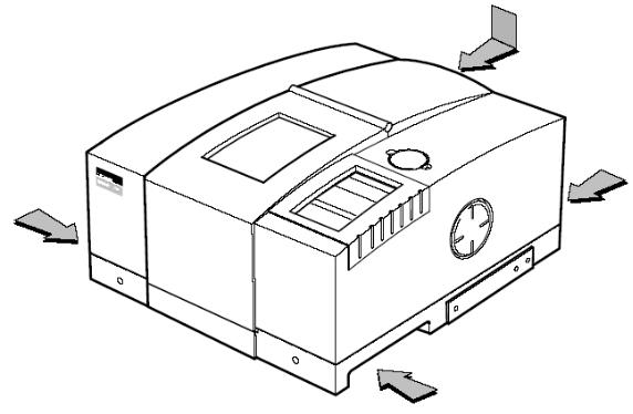 Перед перемещением Spectrum One выключите электропитание, подождите 60 секунд и отсоедините силовой кабель. Прибор может быть поднят снизу за его концы, как показано на рис. 3.5. Необходимы два человека для подъёма прибора, поскольку его общий вес