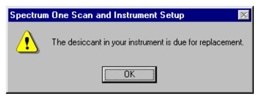 Заменять осушитель надо через каждые шесть месяцев, поскольку старый, использованный осушитель не держит влагу и может вызывать необратимое повреждение оптики на основе KBr. С интервалами, установленными в разделе Maintenance программного обеспечения управления прибором, на экране ПК будет появляться следующее сообщение, предупреждающее о необходимости замены осушителя (рис.3.6.).