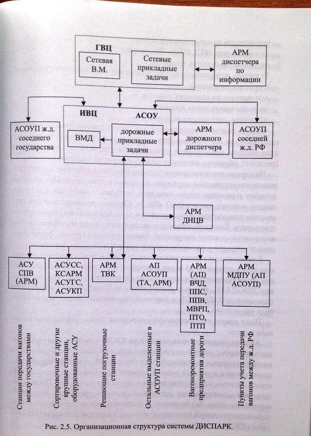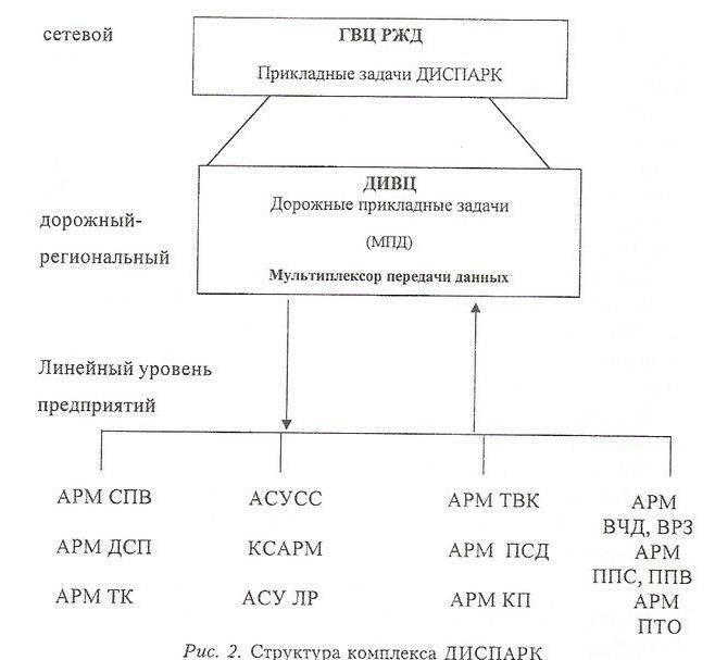 Упр-е грузовым парком представляет собой совокупность инф-онных технологий на трех уровнях -МПС, отделения дорог, линейные предприятия, поэтому ДИСПАРК содержит также три основных уровня: сетевой (ГВЦ МПС), дорожный (ИВЦ железной дороги), линейный (АСУ и отдельные АРМы на базе ПЭВМ для раб-в линейных предприятий)