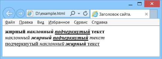 <i>наклонный <b>жирный <u>подчеркнутый</u></b> текст</i> <br>