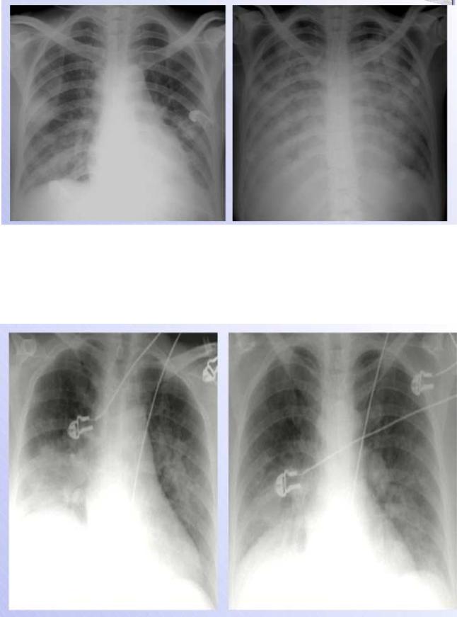 Chest x-ray should be performed in all patients (Fig.25 &26). Pulmonary venous congestion and interstitial or alveolar edema are characteristics of pulmonary edema. Kerley B lines reflect chronic elevation of left atrial pressure and chronic thickening of the intralobular septa from edema.
