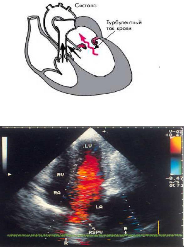 Fig.2. The position of the apical four-chamber hearts: a color Dop pler study of the early diastolic filling of the left v entricle. Registers a unidirectional movement of blood in the pulmonary veins, left atriu m and left ventricle towards the apex o f the heart. LV — left
