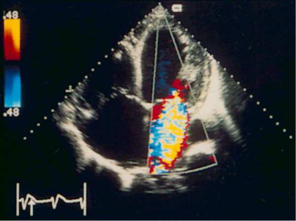 Fig.3 The position of the apical four-chamber hearts. Color Doppler study systolic. Severe mitral insufficiency. The jet has a large diameter at the level of the cusps of the mitral valve, the flow reaches the opposite wall of the left atrium occupies almost all the left atrium and enters the pulmonary veins — these trait s characterize severe mitral regurgitation.
