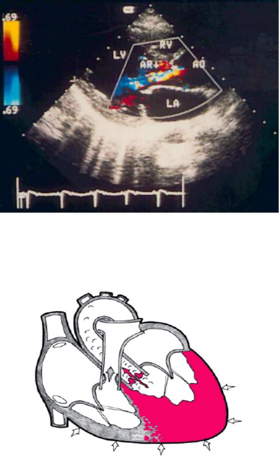 Fig.6. Aortic regurgitation, the severity — from small to moderat e. Color Doppler study of the position of the parasternal long axis of left ventricle. Motley regulatorului flow begins at the level of closin g of the flaps of the aortic valve. LV — left ventricle, LA — left atrium, RV — right ventricle, Ao — ascending aorta, AR — aortic regurgitation.