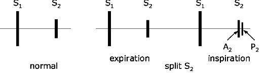 Doubling and splitting of S2 are, as a rule, associated with in crease of blood ejection time of the right ventricle a nd/or decrease of blood ejection time of the left ventricle that leads, respectively, to later appearance of pulmonary component a nd/or earlier appearance of aortic component of S2 (F ig. 17.).