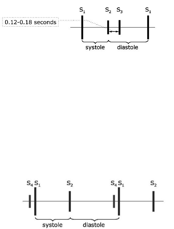 The fourth heart sound (S4) (presystolic) may be heard in systemic hypertension and in idiopathic hypertrophic s ubaortic stenosis. It has been attributed to sudden ventricular distention associated with an augmented left atrial contraction and increased left ventricular end-diastolic str etch (Fig. 19). In healthy people phys iologic fourth sound is very soft, low frequent a nd is found rather rarely, predomin antly in children and teenagers. Pathologic accentuation of S4 in adults is named as pre-systolic gallop rhythm.