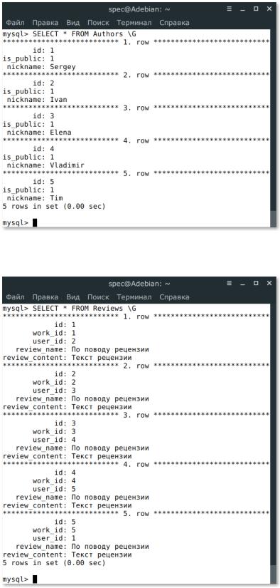 Рисунок 4 — Содержимое таблицы Authors Выведем содержимое таблицы Reviews (рис. 5).