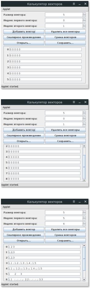 На рис. 4 были приведены примеры корректных с точки зрения программы векторов. В качестве разделителя чисел могут использоваться либо пробелы, либо точки с запятыми, либо запятые, либо любые их сочетания и перестановки. Точка используется в качестве десятичного разделителя (целая и дробная части).