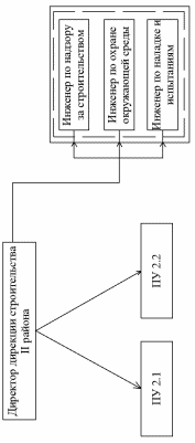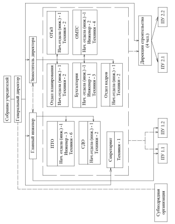 Главному инженеру предприятия решено подчинить производственно-технический и сметно-договорной отделы, а также двое старших прорабов I территориального района. Заместителю директора непосредственно подчинены отделы планирования, бухгалтерия, отдел кадров, отдел материально-технического снабжения и сбыта, а также отдел труда и зарплаты.