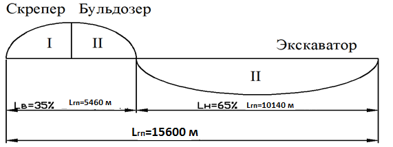 Грунт выемки разрабатывается скрепером и бульдозером. Грунт насыпи полностью разрабатывается экскаватором. Выемка полностью разрабатывается в насыпь. На рис. 2.2 показана схема разработки грунта.