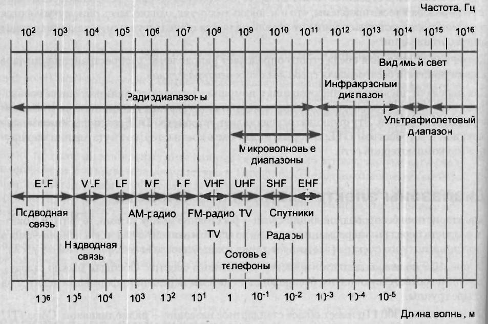 Характеристики беспроводной линии связи — расстояние между узлами, территория охвата, скорость передачи информации и т. п. — во многом зависят от частоты используемого электромагнитного спектра (частота/и длина волны X связаны соотношением с = / х А,). На рис. 10.3 показаны диапазоны электромагнитного спектра. Обобщая можно сказать, что они и соответствующие им беспроводные системы передачи информации делятся на четыре группы.