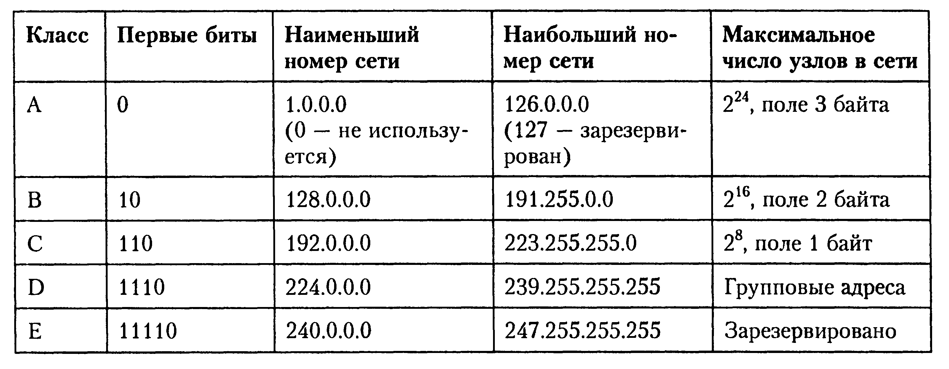 Ниже в таблице приведены диапазоны номеров сетей и максимальное число узлов, соответствующих каждому классу сетей