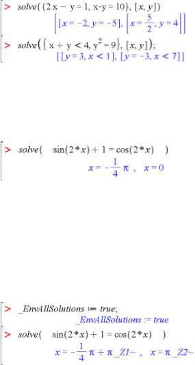 Особливістю тригонометричних рівнянь є те, що їх розв’язок найчастіше повинен бути періодичним числом відповідно до періодичності тригонометричних функцій. Із прикладу 2.4 бачимо, що виводяться розв’язки рівняння лише на одному періоді (оскільки період функцій sin та cos дорівнює 2π, і в рівнянні аргументами sin та cos є 2х, то період відповідно 2π/2 = π). Для того щоб змусити функцію solve навести всі розв’язки, змінній оточення _EnvAllSolutions необхідно присвоїти значення true: