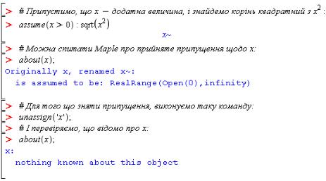 Часто трапляються математичні вирази, коли на їх частину накладаються певні умови (як, наприклад, підлогарифмовий вираз повинен бути додатним, ненульовий знаменник дробу і т. ін.). Перед розв’язуванням рівнянь, що містять такі вирази, рекомендовано це зазначати системі Maple. Це виконується командою assume(), що означає «припустимо, що…».
