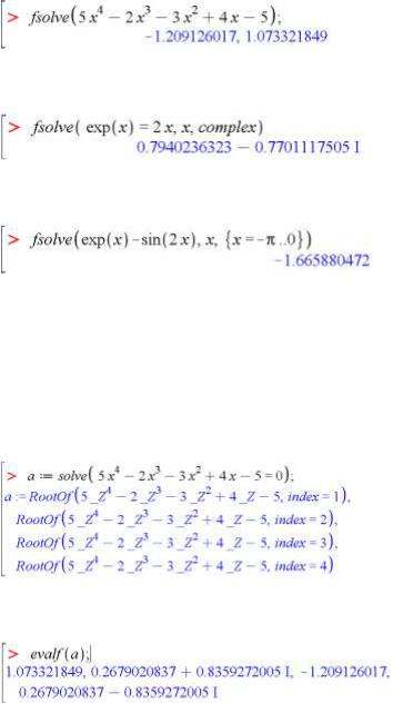 Для отримання числового розв’язку рівняння, нерівності або їх системи використовують функцію fsolve. Вона виводить розв’язок відразу у вигляді дійсних або комплексних чисел. Синтаксис даної функції такий: fsolve(eqns, vars, options), де eqns – рівняння, нерівність або їх система, що підлягає розв’язанню; vars – список невідомих змінних, які необхідно знайти; options – додаткові необов’язкові опції.