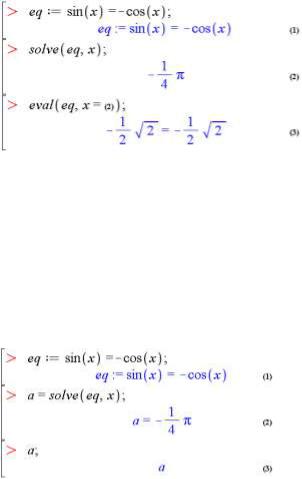 Для точного розв’язання рівнянь, нерівностей та їх систем у символьному вигляді використовується функція solve(eqns, vars), де eqns – рівняння, нерівність або їх система; vars – невідомі змінні, що підлягають визначенню. Якщо змінна лише одна, то Maple може автоматично розпізнати змінну і параметр vars можна опустити.