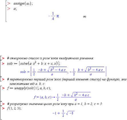 Отриманому розв’язку можна встановити статус функції командою unapply. Якщо розв’язок отримано в загальному, символьному, вигляді, то його статус як функції дозволить у подальшому виконувати підстановки та розраховувати значення при конкретних параметрах. Це ілюструє такий приклад: