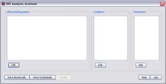 Помічник є інструментом для розв’язання ODE зі зручним інтерфейсом типу «point-and-click» («вказав та клацнув»). Він має назву ODE Analyzer, є аналогом команди dsolve, яку розглянемо наступним пунктом, та викликається з головного меню: Tools → Assistants → ODE Analyzer. Вигляд головного вікна помічника показаний на рис. 2.1. Воно містить три головні поля: