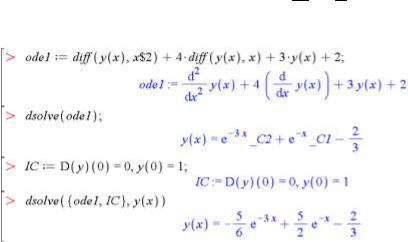 Універсальною командою для розв’язання ODE та їх систем є команда dsolve, яка може знаходити аналітичні та числові розв’язки, а також розв’язки з розвиненням у ряд.