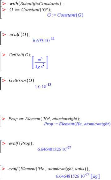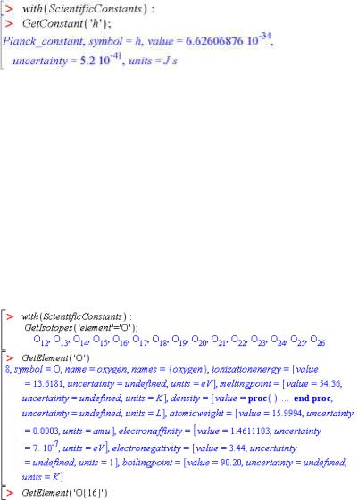 ?ScientificConstants/elements. Для кожного елемента зберігаються його ім’я, атомний номер (1-112, 114, 116), хімічний символ, атомна вага (atomicweight), густина (density), спорідненість з електроном (electronaffinity), та ін. Кожен параметр зберігається з одиницями вимірювання та похибками. Дістати загальну інформацію про властивості елементів можна за командою ?ScientificConstants/properties. Детальну інформацію про доступні ізотопи елемента та властивості кожного з них можна отримати за командами відповідно