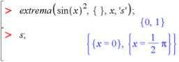 expr – вираз, що досліджується; constraints – обмеження; vars – незалежна змінна або список незалежних змінних; v - ім'я змінної, якій буде функцією extrema присвоєне значення абсциси точки екстремуму. Сама функція extrema повертає значення ординати точки екстремуму. Обмеження constraints являють собою певні вирази або рівняння у вигляді f(x) = 0. У найпростішому випадку замість обмежень зазначають пусті фігурні дужки {}. Наприклад: