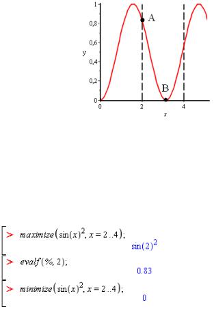 Якщо необхідно дослідити функцію на максимальне або мінімальне значення на певному відрізку, то потрібно мати на увазі, що ці значення не завжди збігаються з екстремальними точками. Наприклад, для тієї ж функції sin2x на відрізку [2; 4] максимальним буде значення в точці А (2; 0,83), а мінімальним буде значення в точці екстремуму В (π; 0) (див. рис. 2.5).
