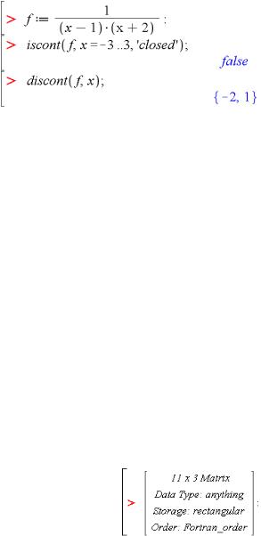 точки відрізку також перевіряються; var – ім'я змінної. При цьому команда discont шукає точки розриву для всіх дійсних значень аргументу var. Наприклад: