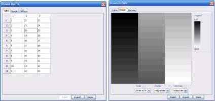 Вкладка Image відображає дані у вигляді кольорових комірок (див. рис. 2.6 б), де числова величина даних відповідає інтенсивності кольору обраної кольорової шкали. Кнопка Insert дозволяє вставити цю картинку в робочий документ. Меню Scale задає масштаб відображення, меню Display задає тип відображення картинки: magnitude – інтенсивність кольору відповідатиме значенню, structure – відображення нульових та ненульових елементів; в меню Colormap можна вибрати кольорову гаму.