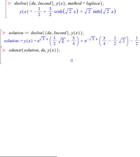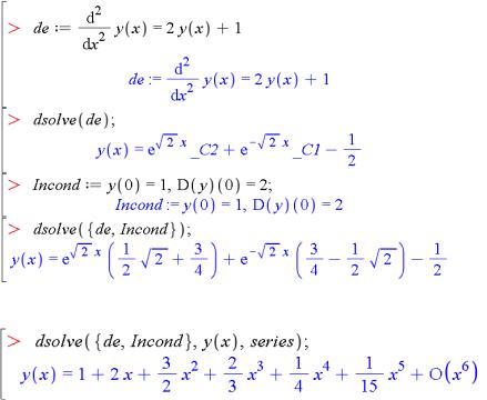 Існують два головні засоби Maple для розв'язування диференціальних рівнянь – це команда dsolve та помічник ODE Analyzer. Використання цих засобів описане в п. 2.2.5. У цьому підрозділі згадаємо використання команди dsolve на прикладах.