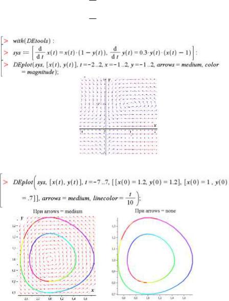 Команда dfieldplot використовується для побудови векторного поля напрямків за результатами розв’язку системи двох автономних диференціальних рівнянь першого порядку або одного диференціального рівняння першого порядку. При цьому вони повинні мати лише одну незалежну змінну.