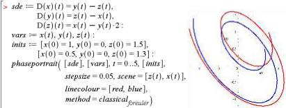 Як бачимо, кількість рівнянь та залежних змінних може бути більшою, ніж два. Тоді для виведення фазового портрета у 2D-варіанті використовується опція scene у вигляді scene=[x(t),z(t)].