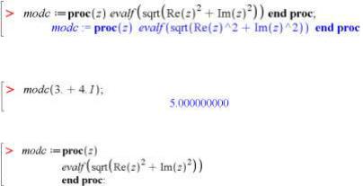 Тут z – це комплексне число, модуль якого обчислюється, і воно є формальним параметром процедури. Значення числа z задається ззовні процедури. Так, наприклад, щоб обчислити модуль для z = 3 + 4i: