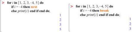 Як видно, для одних і тих самих умов циклу оператор next лише пропускає крок, коли лічильник i = -4, а цикл далі виконується для наступного i. У разі оператора break цикл повністю переривається та для наступних і надалі не виконується.
