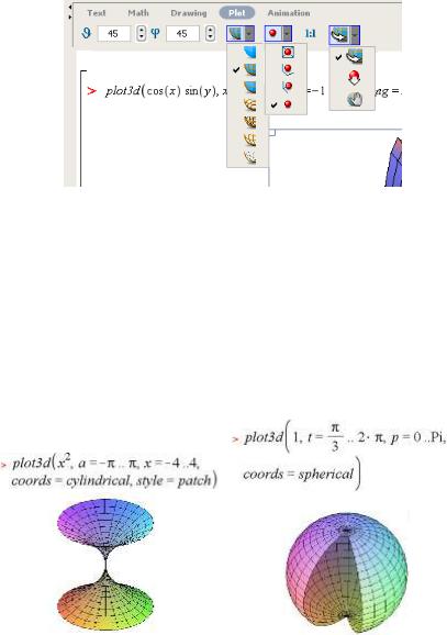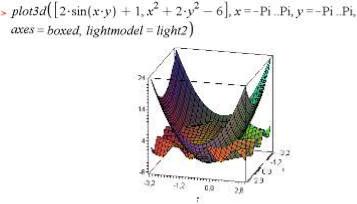 Як бачимо з прикладу, можна будувати одночасно декілька фігур, що перетинаються в просторі. Необхідно задати список функцій поверхонь, і команда plot3d автоматично обчислює точки перетину фігур та виводить зображення перетину в природному для сприйняття вигляді.