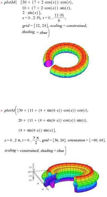 У цьому прикладі будується простий тороїд – циліндр, згорнутий у кільце. При побудові використано прийом видалення частини фігури для більш наочного подання фігури. Насправді параметричне задання рівнянь поверхні відкриває майже невичерпні можливості побудови цікавих та складних фігур різного вигляду: