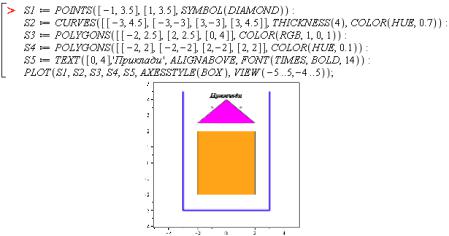 Графічні структури 2D-графіки будуються командою PLOT(s1, s2, …, options), де sі – окремі елементарні структури (примітиви), options – додаткові параметри побудови. Кожен з примітивів визначається з високою точністю в заданій системі координат.