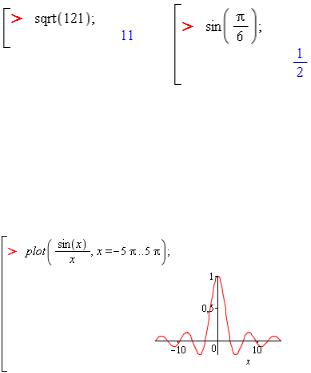 У системі Maple є безліч функцій, вбудованих в ядро, та спеціалізовані пакети. Для того щоб задати функцію у виразі, потрібно ввести її ім’я та список параметрів у круглих дужках. Наприклад, обчислення квадратного кореня або синуса: