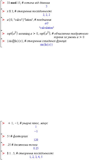 Оператори як об’єкти Maple самі по собі результат не повертають. Але спільно з функціями і операндами (константами або змінними) допомагають конструювати математичні вирази. Залежно від кількості операндів розрізняють бінарні, унарні, нульарні оператори, і, крім того, існує особливий вид оператора – функціональний. Розглянемо