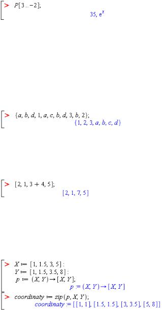 Набори (або множини) – це ряд будь-яких виразів, які створюються за допомогою фігурних дужок {}. Відмінною властивістю наборів є те, що Maple автоматично усуває елементи з однаковим значенням, а також упорядковує елементи за збільшенням значення (якщо числа) та за алфавітом (якщо символи та рядки):