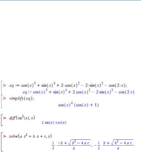 Система Maple проводить точні обчислення з такими величинами, як цілі числа, раціональні, математичні константи, матриці. Їм можна присвоїти певні імена, наприклад x або y, які поряд із математичними функціями типу cos(x) розглядатимуться системою як символьні об’єкти. Результатом символьних обчислень також буде точний результат, який за необхідності можна потім окремо перетворити на наближений.
