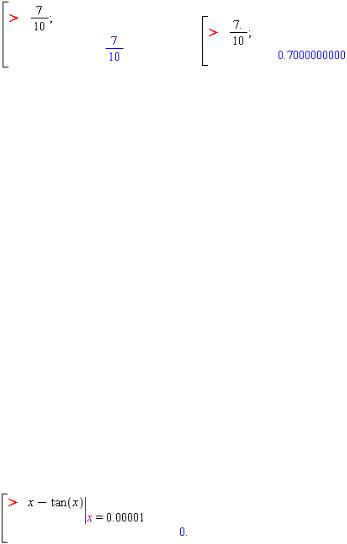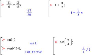 Або при обчисленні значень, наприклад тригонометричних функцій, sin(1) є точним числом, а 0,8414709848 його округлене значення. Таким чином, Maple надає перевагу точному результату: